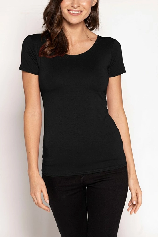 Bluzka z krótkim rękawem i półokrągłym dekoltem to wygodna i uniwersalna baza w codziennej garderobie. Uszyta z miękkiej, oddychającej dzianiny (94% wiskoza, 6% elastan), przyjemnie układa się na ciele i naturalnie dopasowuje do sylwetki. Prosty krój sprawia, że bluzka świetnie łączy się zarówno z jeansami, jak i bardziej eleganckimi elementami garderoby. Sprawdzi się o każdej porze roku – solo lub jako warstwa pod marynarkę czy kardigan.