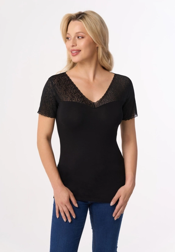 Die Bluse mit kurzen Ärmeln und zarten Spitzeneinsätzen an den Schultern und am Dekolleté ist ein Vorschlag, der Eleganz mit Alltagskomfort verbindet. Aus weichem, atmungsaktivem Strick (94 % Viskose, 6 % Elasthan), liegt es angenehm am Körper und bietet den ganzen Tag über Bewegungsfreiheit.