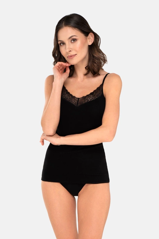 Ciepła koszulka na cienkich ramiączkach szyta z doskonałej jakości 100% bawełny. Delikatna koronka dodana przy dekolcie dodaje jej uroku. Elegancka koronka może być świetną ozdobą wystającą spod np. sweterka z głębokim dekoltem.