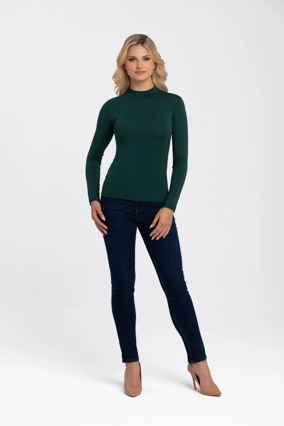 Die Bluse mit langen Ärmeln und einem dezenten halben Rollkragen ist die perfekte Wahl für Frauen, die Komfort und elegante Schlichtheit schätzen. Aus weichem, dehnbarem Strickstoff gefertigt, passt es sich perfekt der Silhouette an und bietet ganztägigen Komfort.
