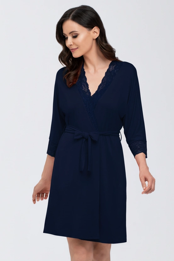 Women's short robe with ¾ sleeves is a unique combination of lightness, comfort and delicate elegance. Made of soft knit fabric (94% viscose, 6% elastane), it pleasantly wraps the body, guaranteeing freedom of movement and natural breathability.