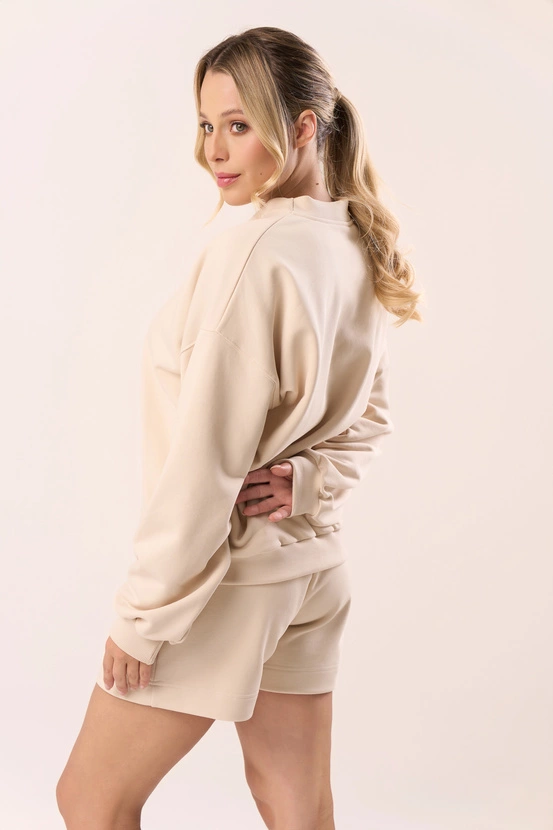 Bluza bez kaptura wykonana z wysokiej jakości dzianiny (90% bawełna, 10% poliester) to wygodny, ponadczasowy element codziennej garderoby. Miękki i oddychający materiał z dodatkiem poliestru zapewnia trwałość, przyjemne dopasowanie do ciała i komfort przez cały dzień. Luźniejszy, swobodny fason z elastycznymi ściągaczami u dołu i przy rękawach sprawia, że bluza dobrze leży i świetnie sprawdza się zarówno w domu, jak i na spacerze, w podróży czy po treningu. Pasuje do spodni dresowych, legginsów i jeansów – jako baza wielu stylizacji.