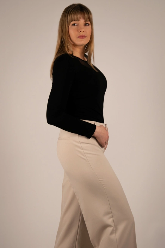 Bluzka została wykonana z wysokogatunkowej wiskozy (94%) z dodatkiem elastanu (6%). Wiskoza to materiał przyjazny dla skóry – oddychający, miękki i przyjemny w dotyku. Dzięki elastanowi bluzka doskonale dopasowuje się do sylwetki, zapewniając pełną swobodę ruchów. To idealne połączenie komfortu i eleganckiego wyglądu.