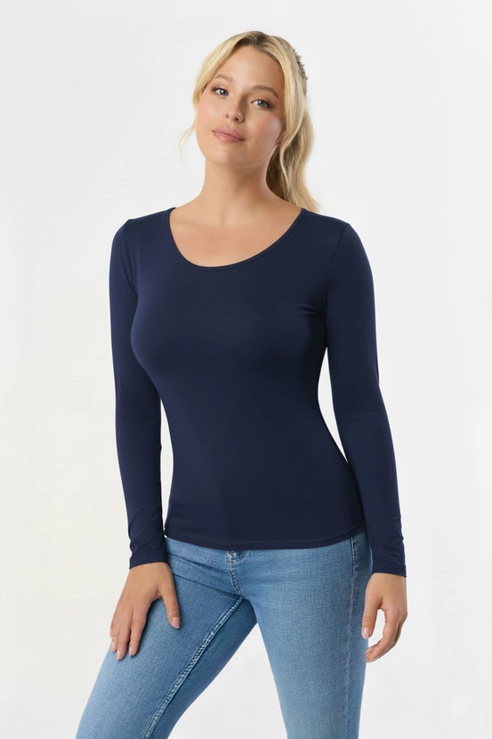 Bluzka z długim rękawem i okrągłym dekoltem to idealny element codziennej garderoby. Uszyta z przyjemnej w dotyku, elastycznej dzianiny (94% wiskoza, 6% elastan), gwarantuje wygodę, przewiewność i naturalne dopasowanie do sylwetki.